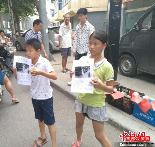 陳國(guó)西11歲的女兒和表弟向路人展示尋人啟事。韓章云 攝