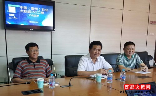中國農(nóng)科院農(nóng)業(yè)信息研究所副所長王文生(左一)、貴州省銅仁高新技術(shù)開發(fā)區(qū)管委會(huì)主任寇啟聰(中)與中國網(wǎng)大數(shù)據(jù)門戶網(wǎng)總裁謝金明(右一)聽取工程進(jìn)展匯報(bào)