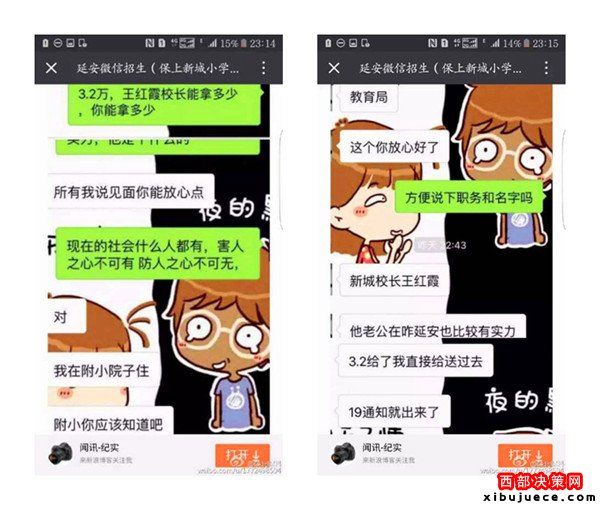 近日,一則題為《延安微信招生(3.2萬(wàn)保上新城小學(xué))請(qǐng)相關(guān)部門(mén)給予調(diào)查公布真相》的帖子在朋友圈瘋傳,內(nèi)容是一位微信名叫“延安微信招生(保上新城小學(xué))”的微友,聲稱(chēng)只要花3.2萬(wàn)元,保證可以在新區(qū)小學(xué)入學(xué),并解釋有中間人,錢(qián)并不是直接給校長(zhǎng)王紅霞,但愿意提供自己的車(chē)號(hào)、身份證號(hào)、家庭住址等信息作為擔(dān)保。3.2萬(wàn)真的能夠保上延安新區(qū)小學(xué)嗎?事情真相究竟如何,記者展開(kāi)調(diào)查。