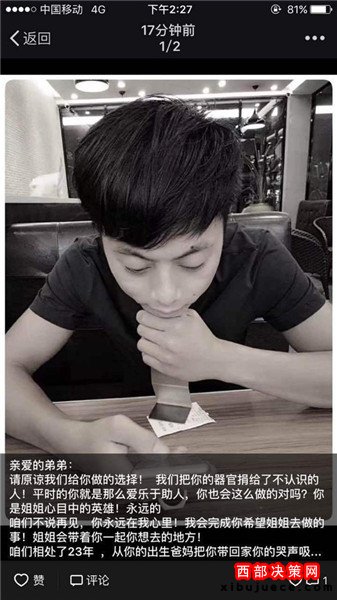 據(jù)了解,22歲的吳遠(yuǎn)旋在東莞鳳崗工作。9月3日凌晨五點(diǎn),他騎摩托車送友人上班時(shí),不幸發(fā)生車禍,導(dǎo)致重度顱腦外傷,達(dá)到腦死亡狀態(tài)。家屬召開家庭會(huì)議后,決定把吳遠(yuǎn)旋所有的重要器官捐獻(xiàn)出來(lái),救助他人。