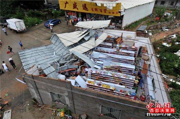 9月15日,今年第14號臺風“莫蘭蒂”于凌晨3時05分在廈門翔安區(qū)沿海登陸,登陸時中心附近最大風力15級(48米/秒,強臺風級),中心氣壓945百帕,給翔安當?shù)貛韲乐負p失。圖為翔安一超市被摧毀。