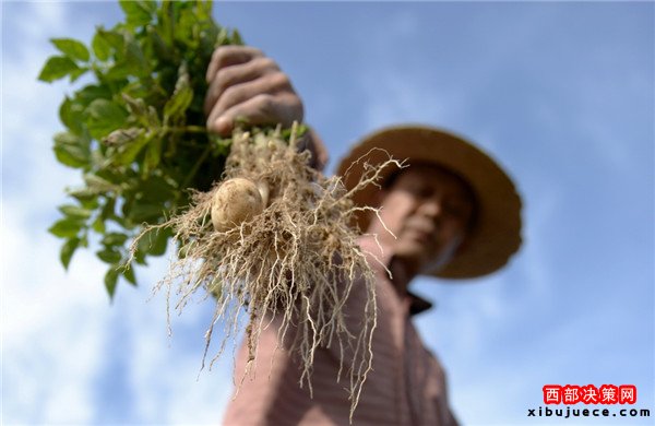 9月28日,在定西市隴西縣德興鄉(xiāng)營門村,一位農(nóng)民展示受旱情影響導(dǎo)致不足雞蛋大小的馬鈴薯。