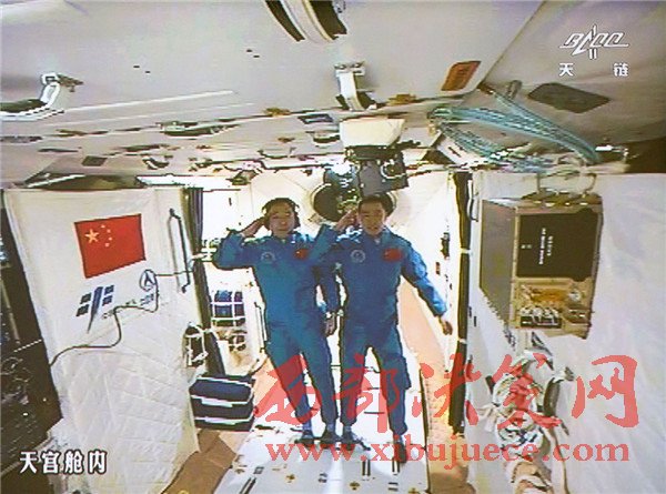 10月19日,神舟十一號航天員景海鵬和陳冬順利進(jìn)入天宮二號實驗艙。景海鵬(左)和陳冬在天宮二號實驗艙向全國人民問好并敬禮(攝于北京航天飛行控制中心大屏幕)。