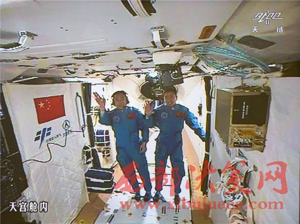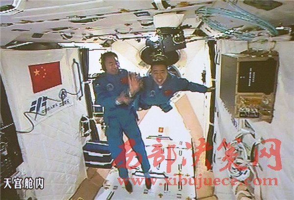 10月19日,神舟十一號航天員景海鵬和陳冬順利進(jìn)入天宮二號實驗艙。這是景海鵬(左)和陳冬在天宮二號實驗艙揮手(攝于北京航天飛行控制中心大屏幕)。