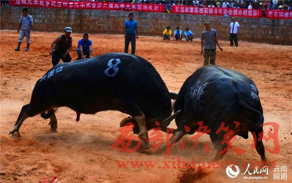 斗牛是石林縣最具民族特色的項目之一,已和當(dāng)?shù)匾妥迦嗣裣喟榱藬?shù)千年,石林很多村莊都會舉辦斗牛比賽。對彝族人民來說,斗牛可以帶來紅火、吉祥,具有有很深的價值寓意。