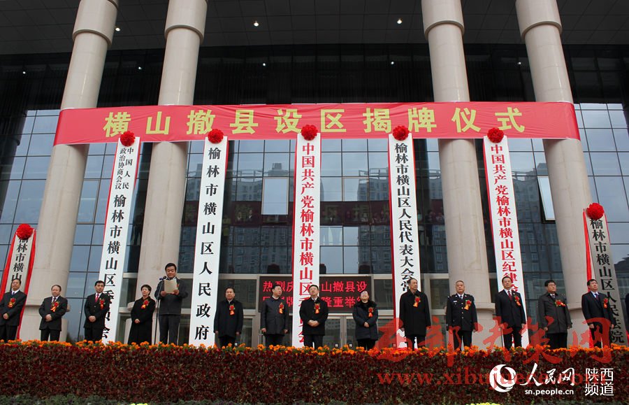 11月9日上午,橫山撤縣設(shè)區(qū)黨政干部大會暨揭牌儀式在橫山舉行。榆林市委書記胡志強(qiáng),市長尉俊東,市政協(xié)主席劉春橋,陜西省民政廳副廳長郭慧敏等出席掛牌儀式。中國共產(chǎn)黨榆林市橫山區(qū)委員會、榆林市橫山區(qū)人民政府正式掛牌。未來,榆林市行政區(qū)劃將變?yōu)?區(qū)10縣。