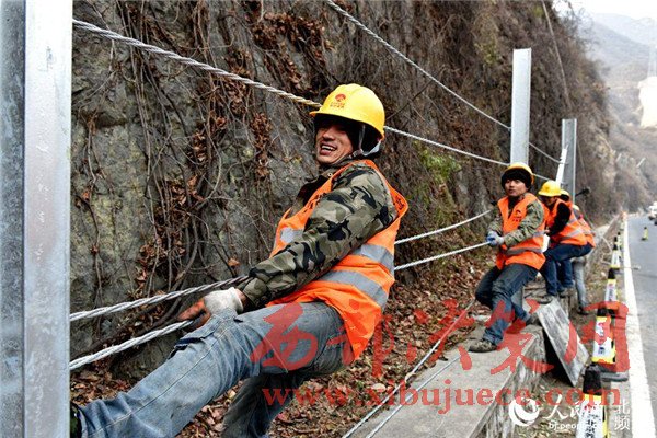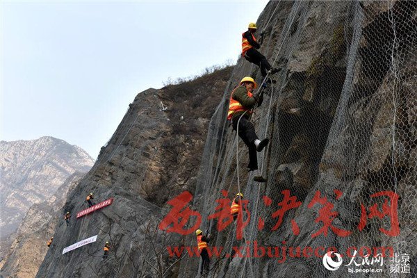北京大山里的蜘蛛人網(wǎng)住懸崖保行車安全