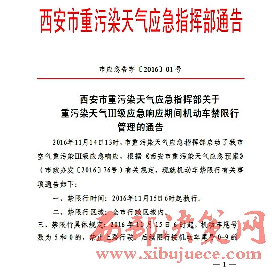 記者從西安市重污染天氣應(yīng)急指揮部了解到,2016年11月14日13時(shí),西安市重污染天氣應(yīng)急指揮部啟動(dòng)了西安市空氣重污染Ⅲ級(jí)應(yīng)急響應(yīng)。根據(jù)《西安市重污染天氣應(yīng)急預(yù)案》(市政辦發(fā)〔2016〕76號(hào))有關(guān)規(guī)定,現(xiàn)就機(jī)動(dòng)車禁限行有關(guān)事項(xiàng)通告如下:
