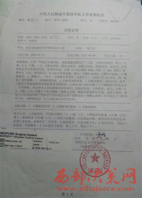 秦見(jiàn)康的出院證明和陜西藍(lán)圖司法鑒定中心的鑒定結(jié)果。秦見(jiàn)康供圖秦見(jiàn)康向澎湃新聞提供的中國(guó)人民解放軍第四軍醫(yī)大學(xué)唐都醫(yī)院的出院證明顯示,秦見(jiàn)康7月21日住院,8月9日出院,醫(yī)院診斷結(jié)果顯示其右眼眶壁骨折,右眼限制性斜視,右眼鈍挫傷。陜西藍(lán)圖司法鑒定中心的鑒定結(jié)果顯示,秦見(jiàn)康構(gòu)成輕傷一級(jí)。