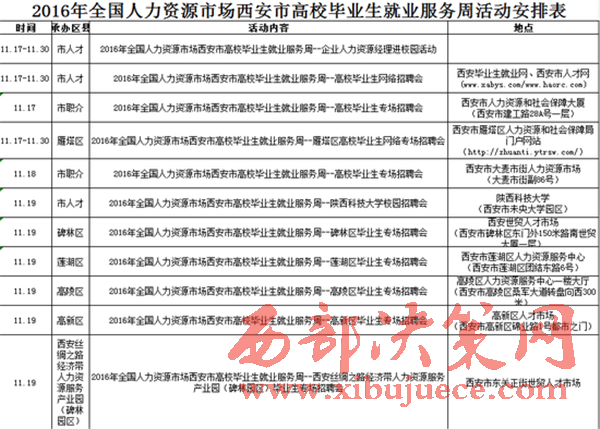 11月17日—11月30日,西安市將舉行2016年全國人力資源市場西安市高校畢業(yè)生就業(yè)服務(wù)周。期間將舉辦高校畢業(yè)生網(wǎng)絡(luò)招聘大會(huì)、現(xiàn)場招聘會(huì)、人力資源服務(wù)產(chǎn)業(yè)園專場招聘活動(dòng)等29場招聘會(huì),幫助高校畢業(yè)生找到滿意工作。