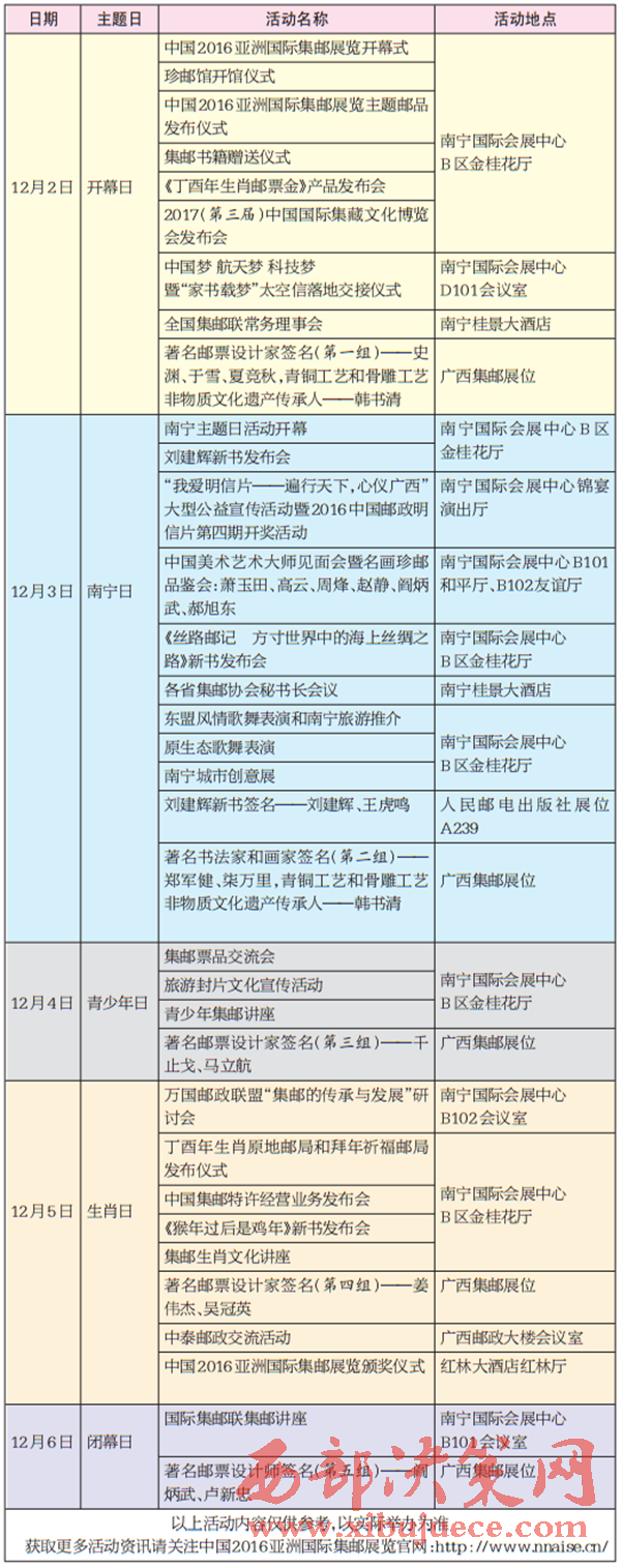 中國(guó)2016亞洲國(guó)際集郵展覽即將于12月2日—6日在南寧舉行,除了精彩的競(jìng)賽性和非競(jìng)賽性展品,郵展期間還將舉辦生肖郵票展示和主題郵局展示等相關(guān)活動(dòng)。展會(huì)還特別設(shè)定了開幕日、南寧日、青少年日、生肖日、閉幕日五個(gè)主題日,下面就來(lái)看看每個(gè)主題日都有哪些豐富的活動(dòng)吧。