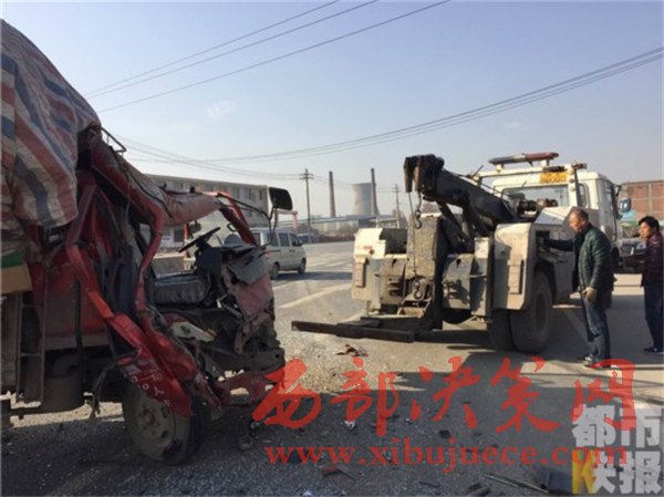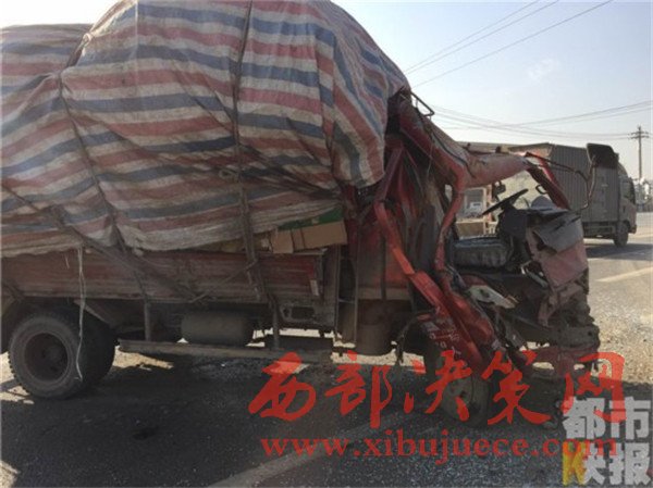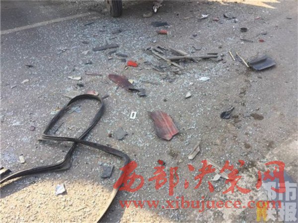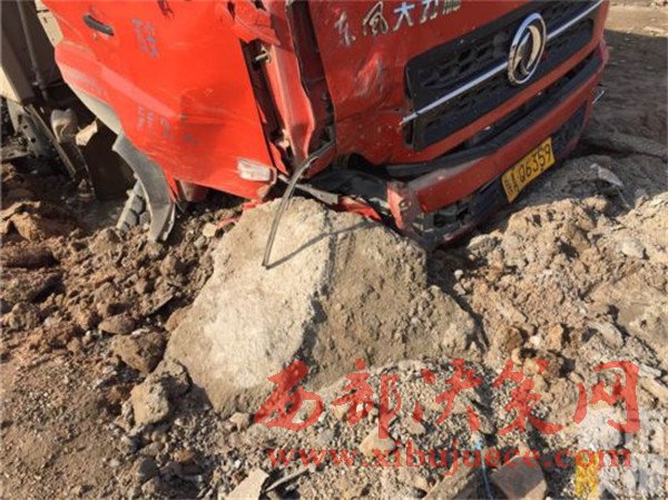 記者在事發(fā)地108國道西安市戶縣境內看到,被撞的小貨車已經面部全非,前部完全破損。而在這邊一輛拉沙車已經沖到了路基下,發(fā)生傾斜。