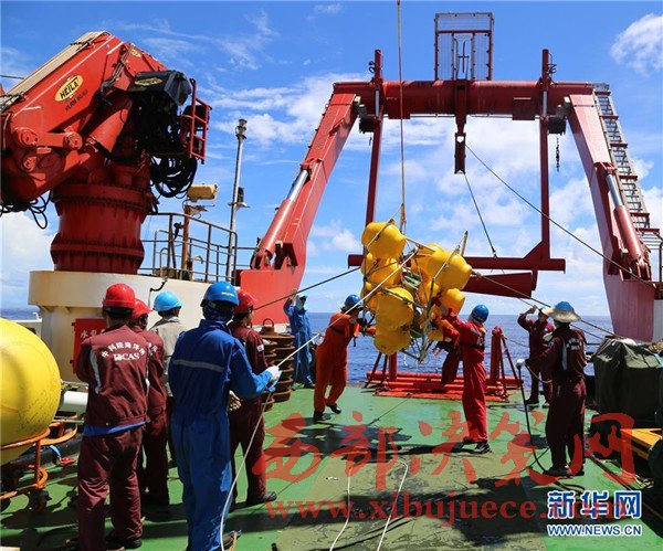 在深海潛標(biāo)回收作業(yè)中,潛標(biāo)主浮體和玻璃浮球浮出水面(11月18日攝)。我國遠(yuǎn)洋綜合考察船“科學(xué)”號正在西太平洋執(zhí)行潛標(biāo)觀測網(wǎng)維護(hù)與升級任務(wù)。截至目前,科考隊(duì)員已獲取了140余件觀測設(shè)備連續(xù)1年的現(xiàn)場數(shù)據(jù),維護(hù)了8套深海潛標(biāo),并重新布放至西太平洋海域。