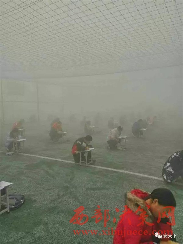 投訴人閆先生給記者發(fā)來(lái)兩張照片,照片顯示,天氣灰蒙蒙的,在一個(gè)露天的足球場(chǎng)上,很多學(xué)生半蹲著趴在凳子上做卷子,由于霧霾太大,第2排后面的學(xué)生身影已經(jīng)很模糊。20日下午3時(shí)50分左右,大河報(bào)記者趕到林州,當(dāng)?shù)氐目諝忪F霾十分嚴(yán)重,能見(jiàn)度只有二三百米。在臨淇鎮(zhèn)一中學(xué)校附近,記者見(jiàn)到了閆先生。他告訴記者,現(xiàn)在學(xué)校已經(jīng)知道記者要來(lái)采訪了,臨時(shí)放假了,考試也取消了。隨后,在校門口,該校八年級(jí)的一名學(xué)生告訴記者,學(xué)校確實(shí)確實(shí)在12月19日考試了,上午考英語(yǔ)和數(shù)學(xué),下午考語(yǔ)文和物理。該學(xué)生告訴記者,八年級(jí)共十個(gè)班,每個(gè)班六七十人,大家都參加了考試,“在操場(chǎng)上考的,搬著凳子在外面”。