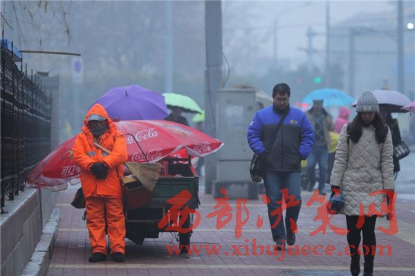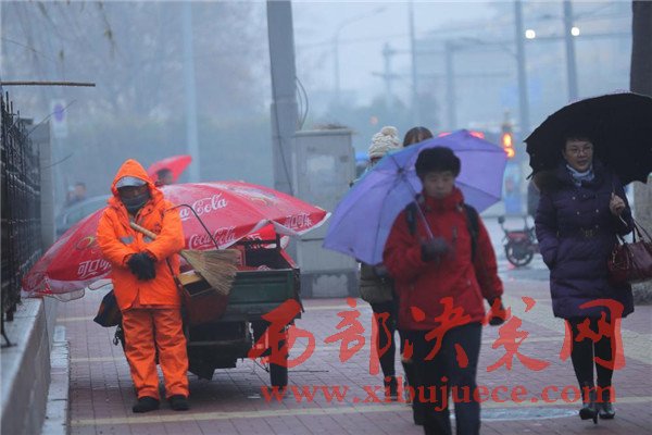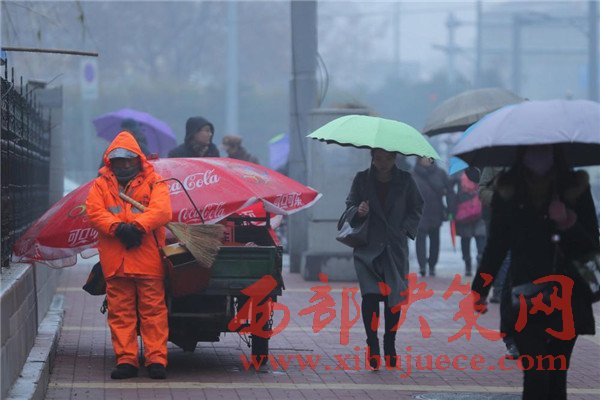 2016年12月26日一早,山東濟南,天空中飄著細細的雪花,一位環(huán)衛(wèi)工人靠在路邊站著睡著了,記者看到,這名環(huán)衛(wèi)工人還懷抱掃把和簸。
