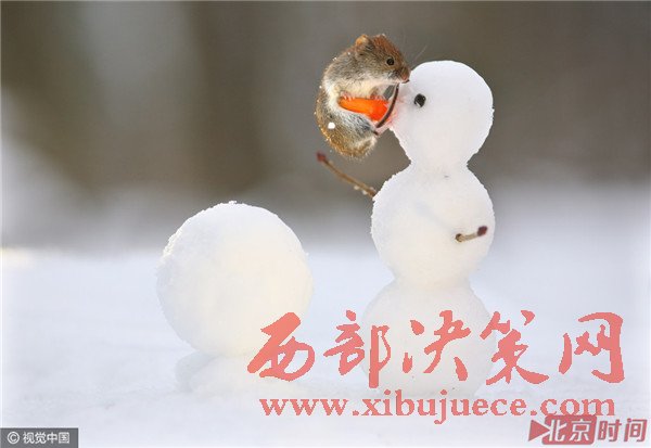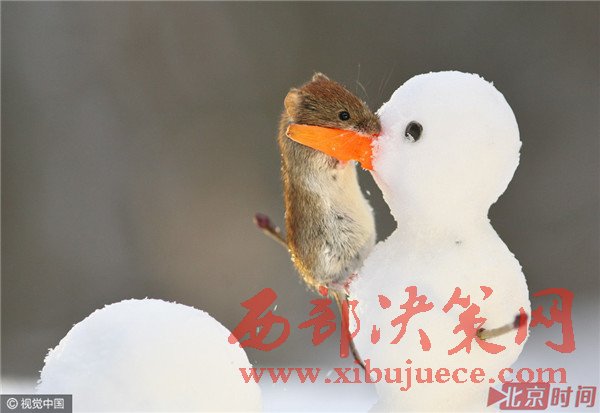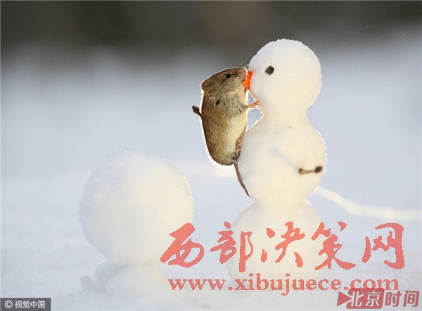 田鼠與小雪人的"親密接觸"