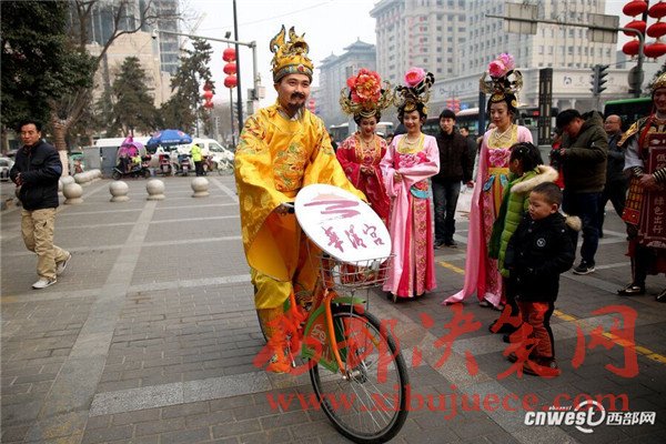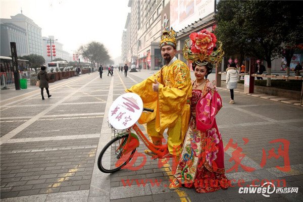 1月18日上午,來自華清宮的 “唐玄宗”與“楊貴妃”身著華麗唐服 “穿越”至西安街頭,為市民發(fā)放“來自唐朝的倡議書”和公交卡,并向交警和清潔工送上暖心禮物。