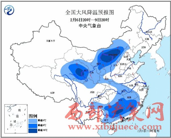 中央氣象臺預(yù)計(jì),6日夜間至9日,我國中東部大部地區(qū)都將自北向南將先后出現(xiàn)大范圍大風(fēng)降溫和雨雪天氣,平均氣溫將普遍下降4℃以上,其中,青海東部、陜西北部、內(nèi)蒙古中部、山西北部、貴州東南部、湖南中南部、江西中南部、福建西部、廣西北部和廣東北部等地氣溫將下降8℃以上,局地超過10℃!長江以北地區(qū)并伴有4——6級偏北風(fēng),東部和南部海區(qū)風(fēng)力有7——9級。