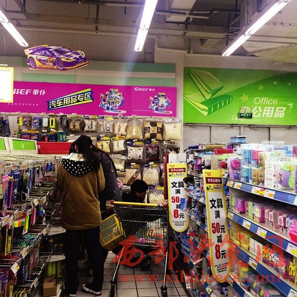 昨日記者在和平門外一超市二樓看到,入口處擺滿了本子、文具盒、書包等學(xué)習(xí)用具,“開學(xué)樂淘淘”的宣傳海報有“買50元,減8元”的優(yōu)惠活動。