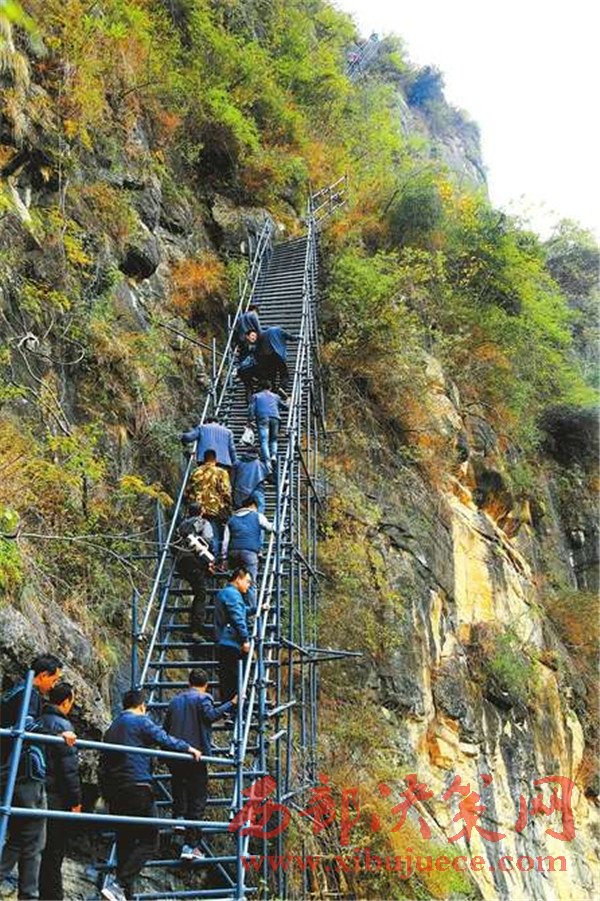 鋼梯,是從去年8月開始啟動修建的,州、縣兩級財政共投入了100萬元。11月,鋼梯完工投入使用。莫色子古說,這些鋼管牢牢焊入懸崖,一共組成21段、767級臺階。整個鋼梯用了大約1500根、40多噸鋼管,光是固定用的扣件,就用了6000多個。