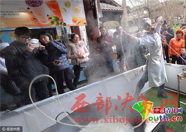 "我當(dāng)時(shí)就想著搞點(diǎn)花樣,來招攬客人。"田波告訴記者,一開始他只是簡單地扭幾個(gè)動(dòng)作,把原來扯面的動(dòng)作,變得更花哨。