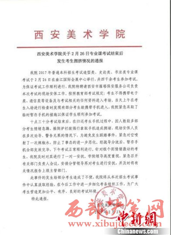 西安美術(shù)學(xué)院發(fā)布的事件通報(bào)稱,考試結(jié)束后,在歸還手機(jī)過程中,因人數(shù)較多部分考生情緒急躁,推倒護(hù)欄欲強(qiáng)行拿取手機(jī)造成擁堵,現(xiàn)場安保人員在多次勸導(dǎo)、警告無果的情況下,為避免發(fā)生踩踏時(shí)間,緊急對(duì)空噴射了一次辣椒水,防止了事態(tài)的進(jìn)一步惡化。經(jīng)疏導(dǎo)分流后,暫存手機(jī)全部發(fā)放完畢,下午考試順利進(jìn)行。針對(duì)個(gè)別情緒激動(dòng)的考生,該院即使對(duì)其進(jìn)行了一對(duì)一安撫。學(xué)院領(lǐng)導(dǎo)高度重視,緊急召開有關(guān)部門負(fù)責(zé)人會(huì)議,安排分管領(lǐng)導(dǎo)再對(duì)考生進(jìn)行安撫,并及時(shí)將有關(guān)情況報(bào)告上級(jí)主管部門。此事件的發(fā)生給部分考生造成了不便,該院將從本次招生考試事件中認(rèn)真汲取經(jīng)驗(yàn),在今后工作中進(jìn)一步細(xì)化考務(wù)組織工作,為廣大考生營造更加公平、有序、良好的考試環(huán)境。