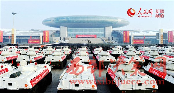 新疆國際會展中心廣場上,1萬余名武警官兵、公安民警、民兵預(yù)備役人員等各維穩(wěn)力量緊握鋼槍盾牌、整齊列隊挺立,直升機在空中盤旋,一輛輛軍車、裝甲車、摩托車列隊待發(fā)。