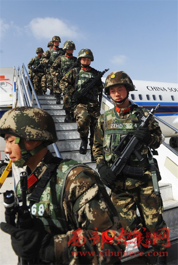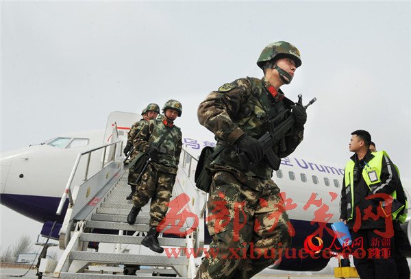 參加反恐維穩(wěn)誓師大會的武警官兵到達阿克蘇機場,向任務(wù)區(qū)進發(fā)。