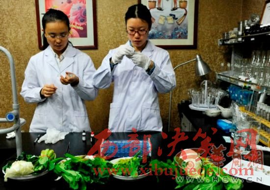 華商報(bào)記者在市場(chǎng)上購(gòu)買了新鮮的菠菜,白菜,小白菜,油麥菜,青菜,拿到西安營(yíng)養(yǎng)學(xué)會(huì),專家通過(guò)實(shí)驗(yàn)的方法,檢測(cè)新鮮蔬菜、冰箱存放48小時(shí)的蔬菜、常溫存放48小時(shí)的蔬菜中亞硝酸鹽含量的變化。