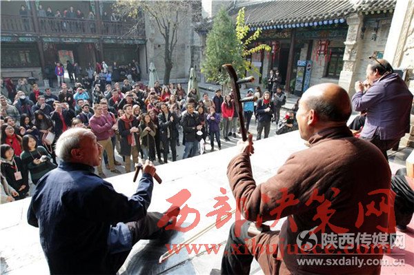 11月15日,北京大學燕京學堂的丹麥、以色列等42個國家的100多名外國留學生,來到西安了解中國傳統(tǒng)文化和城市發(fā)展及變化,在關中民俗藝術博物院,“老外”對華陰老腔產(chǎn)生濃厚興趣,現(xiàn)場向老藝人學唱華陰老腔。