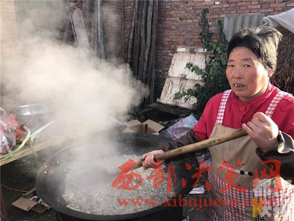 12月4日, 戶縣渭豐鎮(zhèn)元二村,村民們正在興高采烈的烹制著美味大餐,熱鬧非凡,頗有一種過大年的氣氛。熱氣騰騰的臊子面出鍋了,這第一碗面當然要親手端給今天這場特殊宴會的主角——百歲老人段奶奶。
