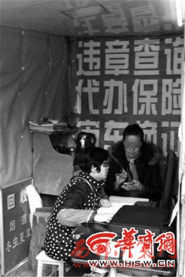 昨日上午9時許,華商報記者在這家門店外面看到,門口除了一個“代辦保險 違章查詢 復印”的廣告牌之外,還有“高價回收,金銀加工回收”的牌子。門店里有個電腦,一名女子在電腦前不斷地查詢著違法信息。
