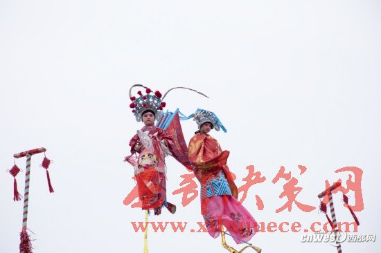 兩個小孩正在進行社火表演。