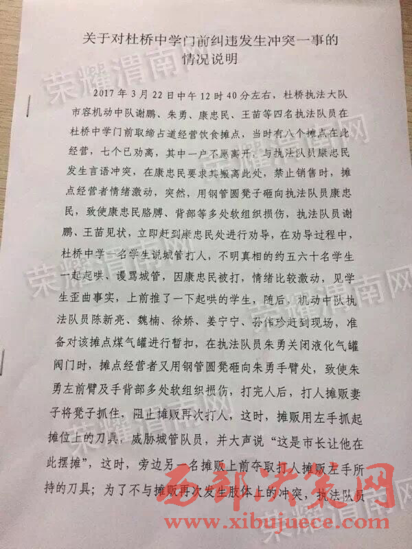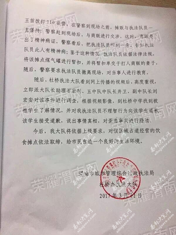 當(dāng)晚6點(diǎn)以后,涉事執(zhí)法隊(duì)員所屬執(zhí)法大隊(duì)杜橋執(zhí)法大隊(duì)書面回復(fù)便在網(wǎng)絡(luò)中被網(wǎng)友們不斷的轉(zhuǎn)載。據(jù)該回復(fù)稱:2017年3月22日中午12時(shí)40分左右,杜橋執(zhí)法大隊(duì)市容機(jī)動(dòng)中隊(duì)謝鵬、朱勇、康忠民、王苗等4名執(zhí)法隊(duì)員在杜橋中學(xué)門前取締占道經(jīng)營(yíng)飲食攤點(diǎn),當(dāng)時(shí)有八個(gè)攤點(diǎn)在此經(jīng)營(yíng),七個(gè)已勸離,其中一戶不愿離開,與執(zhí)法隊(duì)員康忠民發(fā)生言語(yǔ)沖突,在康忠民要求其搬離此處,禁止銷售時(shí),攤點(diǎn)經(jīng)營(yíng)者情緒激動(dòng),突然,用鋼管圓凳子砸向執(zhí)法隊(duì)員康忠民,致使康忠民胳膊、背部等多處軟組織損傷,執(zhí)法隊(duì)員謝鵬、王苗等見(jiàn)狀,立即趕到康忠民處進(jìn)行勸導(dǎo),在勸導(dǎo)過(guò)程中,杜橋中學(xué)一名學(xué)生說(shuō)城管打人,不明真相的約五六十名學(xué)生一起起哄、謾罵城管,因康忠民被打,情緒比較激動(dòng),見(jiàn)學(xué)生歪曲事實(shí),上前推了一下起哄的學(xué)生,隨后,機(jī)動(dòng)中隊(duì)執(zhí)法隊(duì)員朱勇、陳新亮、魏楠、徐嬌、姜寧寧、孫偉珍趕到現(xiàn)場(chǎng),準(zhǔn)備對(duì)該攤點(diǎn)煤氣罐進(jìn)行暫扣,在執(zhí)法隊(duì)員朱勇關(guān)閉液化氣罐閥門時(shí),攤點(diǎn)經(jīng)營(yíng)者用鋼管圓凳砸向朱勇手臂處,致使朱勇左前臂及手背部多處軟組織損傷,打完人后,打人攤販妻子將凳子抓住,阻止攤販再次打人,這時(shí),攤販用左手抓起攤位上的刀具,威脅城管隊(duì)員,并大聲說(shuō)“這是市長(zhǎng)讓他在此擺攤”,這時(shí),旁邊另一名攤販上前奪取打人攤販左手所持的刀具;為了不與攤販再次發(fā)生肢體上的沖突,執(zhí)法隊(duì)員王苗撥打110報(bào)警,在警察到現(xiàn)場(chǎng)之前,攤販與執(zhí)法隊(duì)員一直僵持;警察趕到現(xiàn)場(chǎng)后,與商販進(jìn)行交涉,這時(shí),商販亮出了精神病證,警察看后,把執(zhí)法隊(duì)員叫到一旁,告知執(zhí)法隊(duì)員此人有精神??;鑒于這種情況,執(zhí)法隊(duì)員依據(jù)法律法規(guī),將該攤點(diǎn)煤氣罐進(jìn)行暫扣,并將暫扣單交于打人商販的妻子,隨后,警察要求執(zhí)法隊(duì)員撤離現(xiàn)場(chǎng),對(duì)當(dāng)事人進(jìn)行教育。