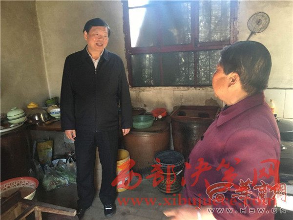 婁勤儉詳細了解了老人家庭成員、收入來源等,詢問了干部定點幫扶情況。隨后,他走進屋里察看生活情況,在土坑邊彎下腰了解如何取暖,在廚房詢問吃水等情況。走出廚房后,他感嘆,“條件確實不太好,我們的工作還得加把勁啊!”