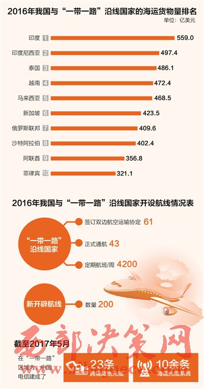 據(jù)統(tǒng)計,通過73個公路和水路口岸,中國與相關(guān)國家開通了356條國際道路客貨運輸線路;海上運輸服務(wù)已覆蓋“一帶一路”沿線所有國家;與43個沿線國家實現(xiàn)空中直航,每周約4200個航班;簡化了國際鐵路聯(lián)運辦理手續(xù),促進中歐間國際鐵路貨物聯(lián)運,開展國際鐵路運郵合作。