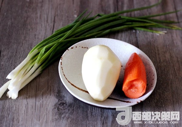 土豆一個(gè)、胡蘿卜一段、小蔥適量、淀粉適量、菜籽油適量、鹽適量、黑胡椒粉適量。