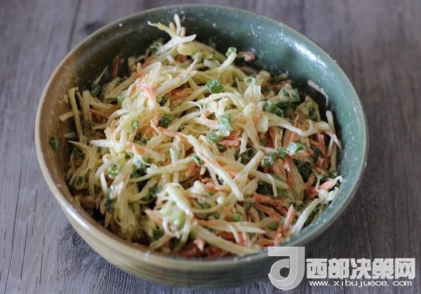土豆絲、胡蘿卜絲、小蔥放一起,加入適量鹽、菜籽油、淀粉,充分拌勻。