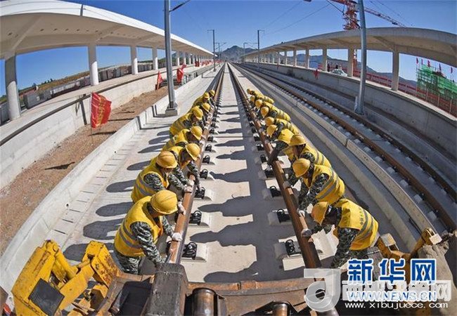 中鐵十九局工程人員在京沈高鐵凌源南站進行鋪軌作業(yè)(9月28日攝)。(記者 楊青 攝)