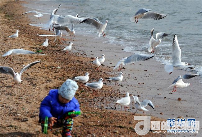 12月28日,一名小男孩在青島棧橋景區(qū)附近沙灘上玩耍。每到冬季,大批海鷗從西伯利亞等地飛臨青島越冬避寒,它們多集中停留在青島沿海一線,吸引眾多市民和游客前來(lái)觀賞和拍攝。(記者 李紫恒 攝)