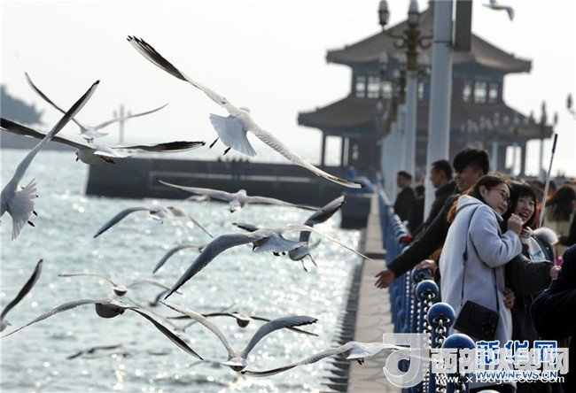 12月28日,游客在青島棧橋景區(qū)觀賞海鷗。每到冬季,大批海鷗從西伯利亞等地飛臨青島越冬避寒,它們多集中停留在青島沿海一線,吸引眾多市民和游客前來(lái)觀賞和拍攝。 (記者 李紫恒 攝)