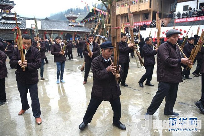 1月18日,在榕江縣仁里鄉(xiāng)仁吉侗寨,人們在吹奏蘆笙。記者戴天放攝