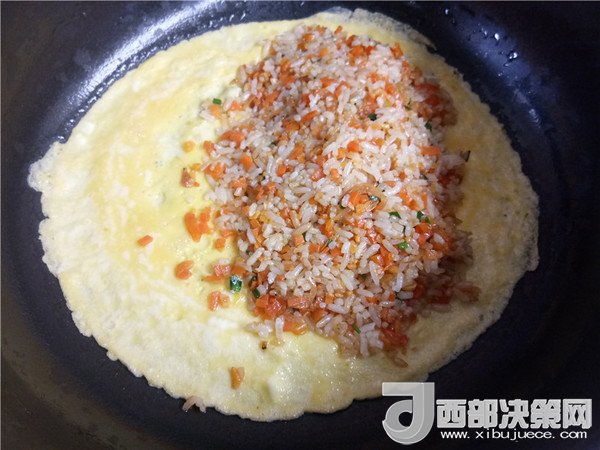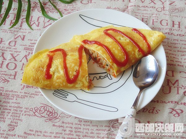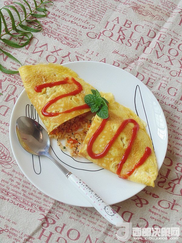 14.將炒好的飯倒入煎好蛋皮的一側(cè),另一邊折過(guò)來(lái)邊緣對(duì)齊。擠上番茄沙司裝飾即可開吃。