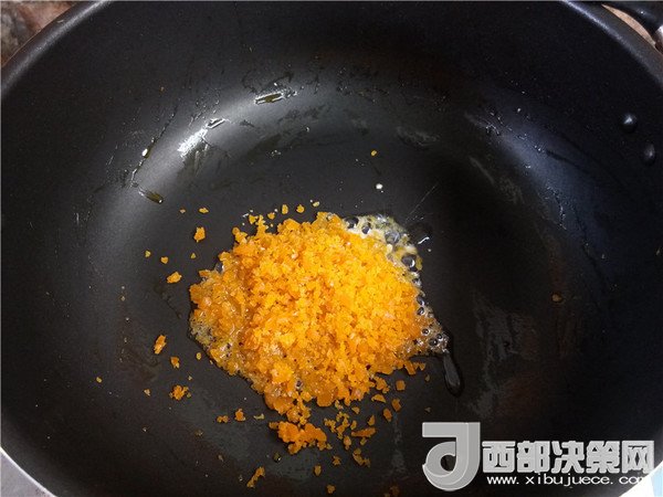 6.鍋內(nèi)放適量油,倒入咸蛋末。