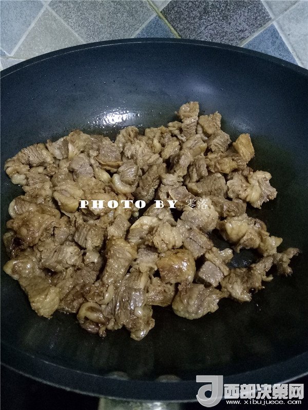 5.放入冰糖,炒出糖色后,再放入牛腩肉,翻炒上色;