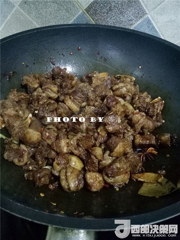 6.烹入料酒,繼續(xù)翻炒;再放入姜片、蔥段、蒜瓣、干辣椒、花椒、八角、三奈、小茴香、香葉、草果炒香;