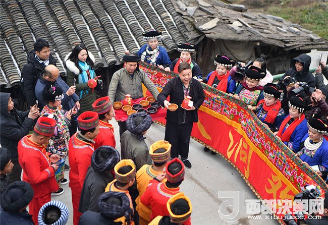 2018年2月4日,在湖南省湘西土家族苗族自治州花垣縣十八洞村,新郎的迎親隊伍遇上新娘親友攔門。當(dāng)日,兩對分別來自湘西和湘潭的新人特地來到十八洞村體驗苗族婚禮。新華社發(fā)(薛宇舸 攝)