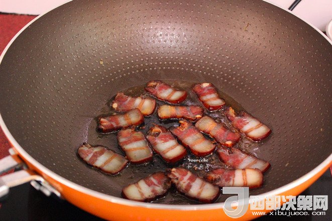 4.熱鍋,倒油,小火煎臘肉至熟,起鍋;