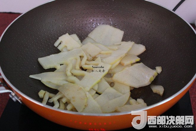 5.蒜末煸香,倒入筍爆炒至八成熟;
