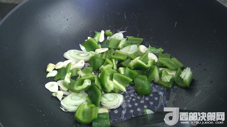 輔料料:酒5 克   胡椒粉 1克   淀粉 15克   青椒 1個(gè)   蔥白 3克   蒜片 3克   姜末 1克   生抽 2克   鹽 3克   白糖 5克